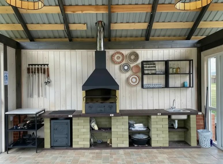 Такие комплексы могут включать не только мангал, но и целую уличную кухню с дополнительными элементами приготовления пищи.